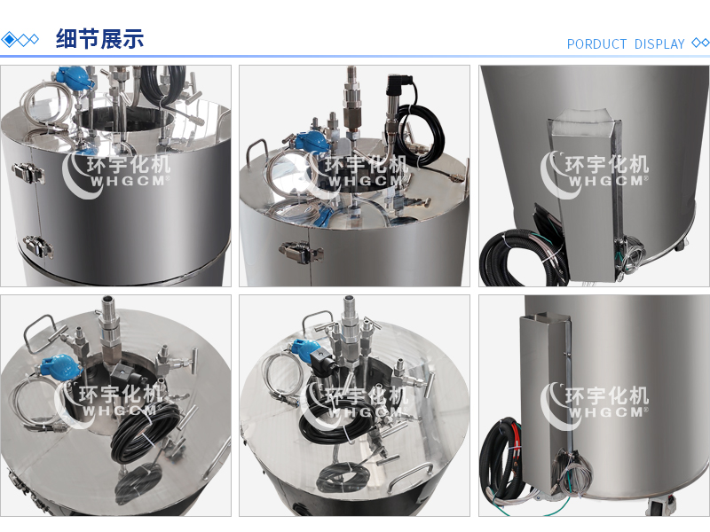 常規釜蓋開口 氣相口配針形閥,液相口配針形閥及釜內插底管,固體加料口配絲堵,測控溫口配鉑電阻,壓力表安全爆破口配壓力表及安全防爆裝置,釜內冷卻盤管進、出口配水咀