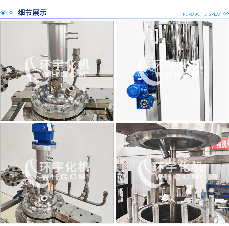 常規釜蓋開口 氣相口配針形閥,液相口配針形閥及釜內插底管,固體加料口配絲堵,測控溫口配鉑電阻,壓力表安全爆破口配壓力表及安全防爆裝置,釜內冷卻盤管進、出口配水咀