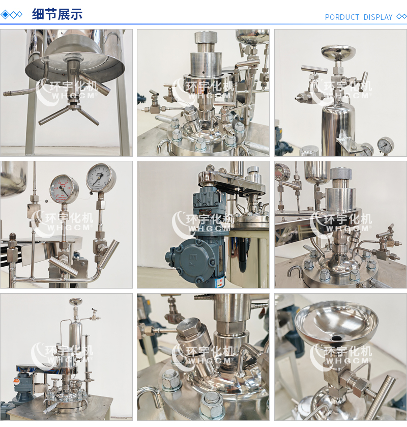 常規釜蓋開口 氣相口配針形閥,液相口配針形閥及釜內插底管,固體加料口配絲堵,測控溫口配鉑電阻,壓力表安全爆破口配壓力表及安全防爆裝置,釜內冷卻盤管進、出口配水咀