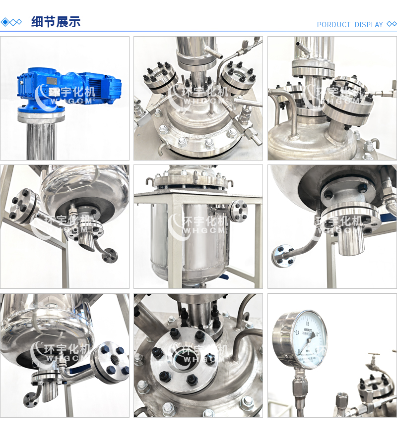 常規釜蓋開口 氣相口配針形閥,液相口配針形閥及釜內插底管,固體加料口配絲堵,測控溫口配鉑電阻,壓力表安全爆破口配壓力表及安全防爆裝置,釜內冷卻盤管進、出口配水咀