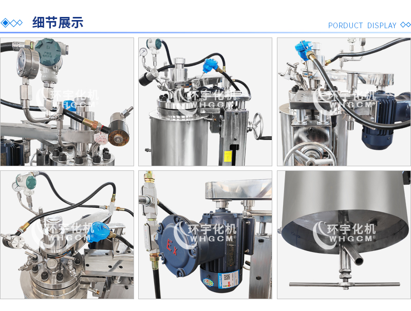 常規釜蓋開口 氣相口配針形閥,液相口配針形閥及釜內插底管,固體加料口配絲堵,測控溫口配鉑電阻,壓力表安全爆破口配壓力表及安全防爆裝置,釜內冷卻盤管進、出口配水咀