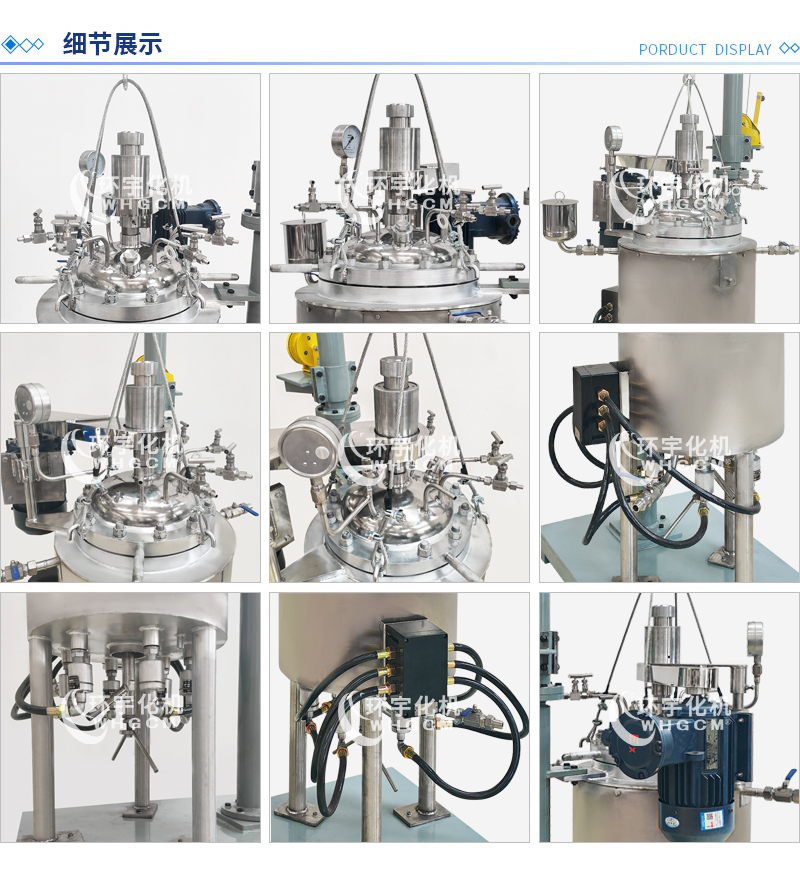 常規釜蓋開口 氣相口配針形閥,液相口配針形閥及釜內插底管,固體加料口配絲堵,測控溫口配鉑電阻,壓力表安全爆破口配壓力表及安全防爆裝置,釜內冷卻盤管進、出口配水咀