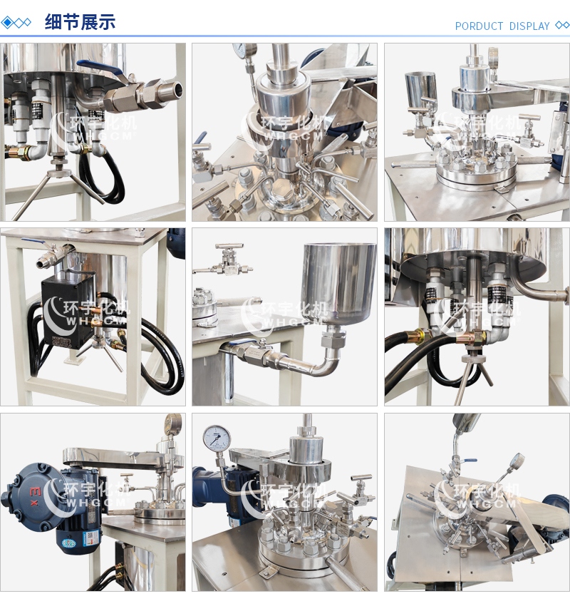 常規釜蓋開口 氣相口配針形閥,液相口配針形閥及釜內插底管,固體加料口配絲堵,測控溫口配鉑電阻,壓力表安全爆破口配壓力表及安全防爆裝置,釜內冷卻盤管進、出口配水咀