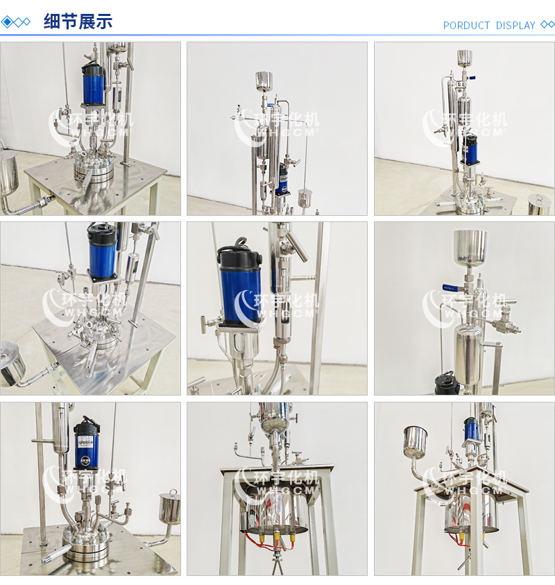 常規釜蓋開口 氣相口配針形閥,液相口配針形閥及釜內插底管,固體加料口配絲堵,測控溫口配鉑電阻,壓力表安全爆破口配壓力表及安全防爆裝置,釜內冷卻盤管進、出口配水咀