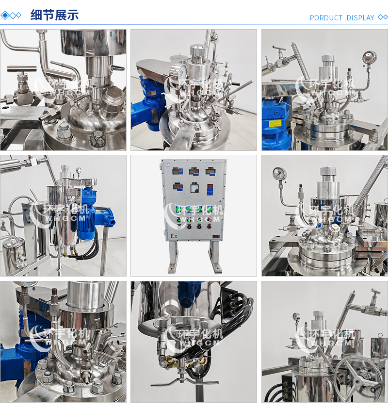 常規釜蓋開口 氣相口配針形閥,液相口配針形閥及釜內插底管,固體加料口配絲堵,測控溫口配鉑電阻,壓力表安全爆破口配壓力表及安全防爆裝置,釜內冷卻盤管進、出口配水咀