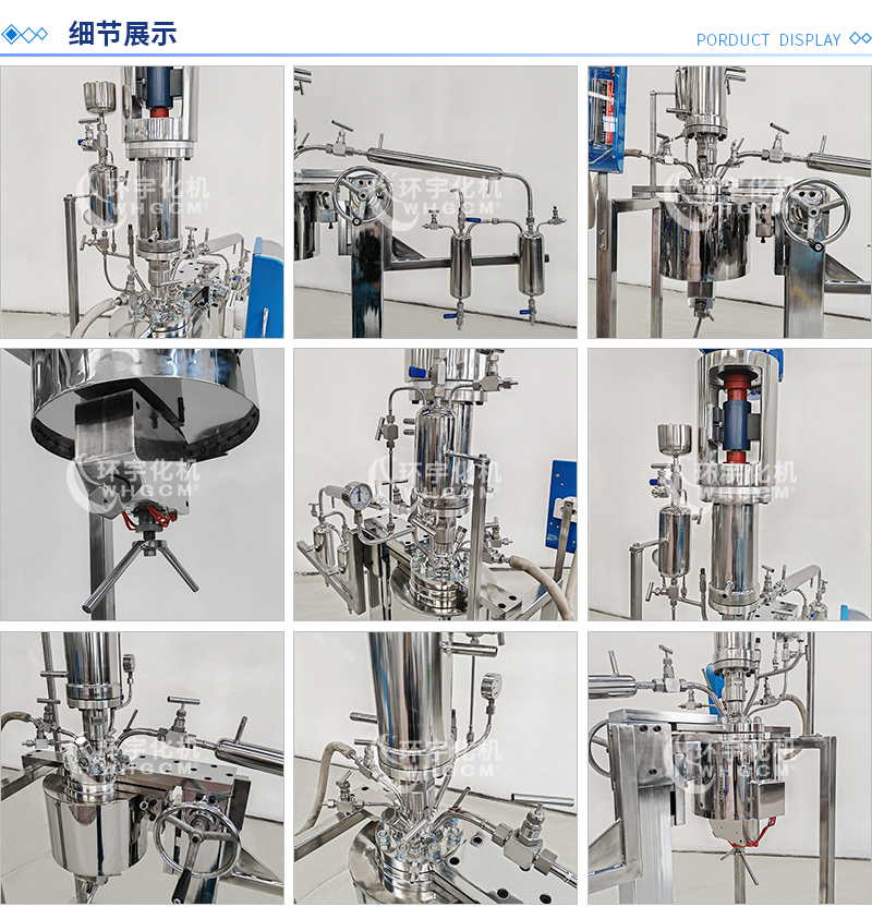 常規釜蓋開口 氣相口配針形閥,液相口配針形閥及釜內插底管,固體加料口配絲堵,測控溫口配鉑電阻,壓力表安全爆破口配壓力表及安全防爆裝置,釜內冷卻盤管進、出口配水咀