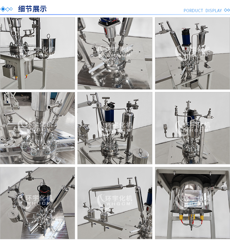常規釜蓋開口 氣相口配針形閥,液相口配針形閥及釜內插底管,固體加料口配絲堵,測控溫口配鉑電阻,壓力表安全爆破口配壓力表及安全防爆裝置,釜內冷卻盤管進、出口配水咀