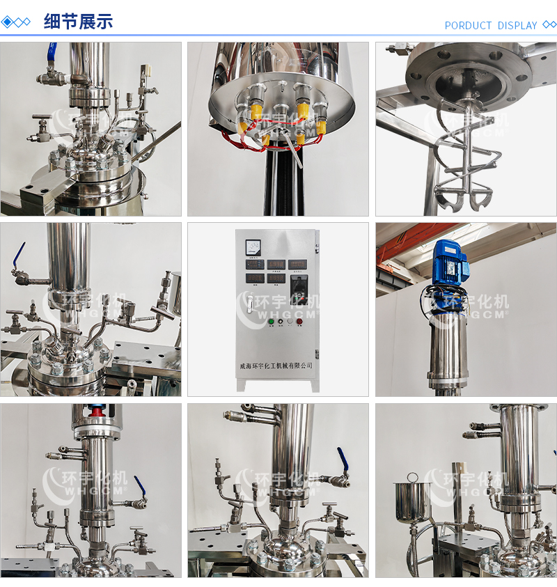 常規釜蓋開口 氣相口配針形閥,液相口配針形閥及釜內插底管,固體加料口配絲堵,測控溫口配鉑電阻,壓力表安全爆破口配壓力表及安全防爆裝置,釜內冷卻盤管進、出口配水咀