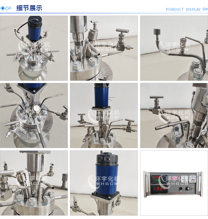 常規釜蓋開口 氣相口配針形閥,液相口配針形閥及釜內插底管,固體加料口配絲堵,測控溫口配鉑電阻,壓力表安全爆破口配壓力表及安全防爆裝置,釜內冷卻盤管進、出口配水咀