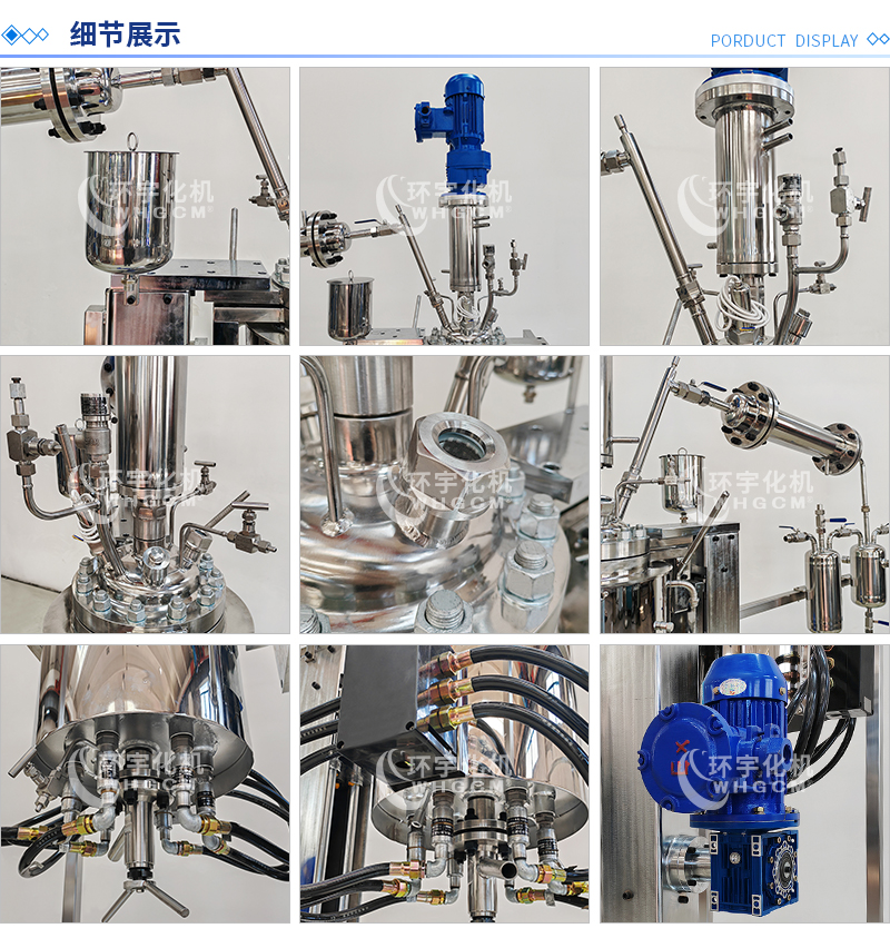 常規釜蓋開口 氣相口配針形閥,液相口配針形閥及釜內插底管,固體加料口配絲堵,測控溫口配鉑電阻,壓力表安全爆破口配壓力表及安全防爆裝置,釜內冷卻盤管進、出口配水咀