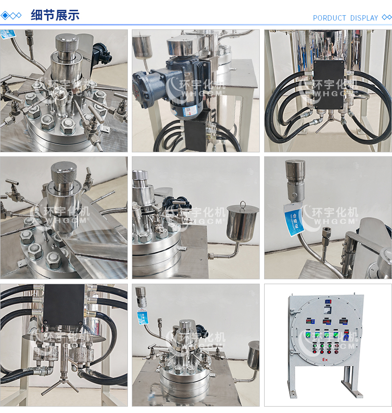 常規釜蓋開口 氣相口配針形閥,液相口配針形閥及釜內插底管,固體加料口配絲堵,測控溫口配鉑電阻,壓力表安全爆破口配壓力表及安全防爆裝置,釜內冷卻盤管進、出口配水咀