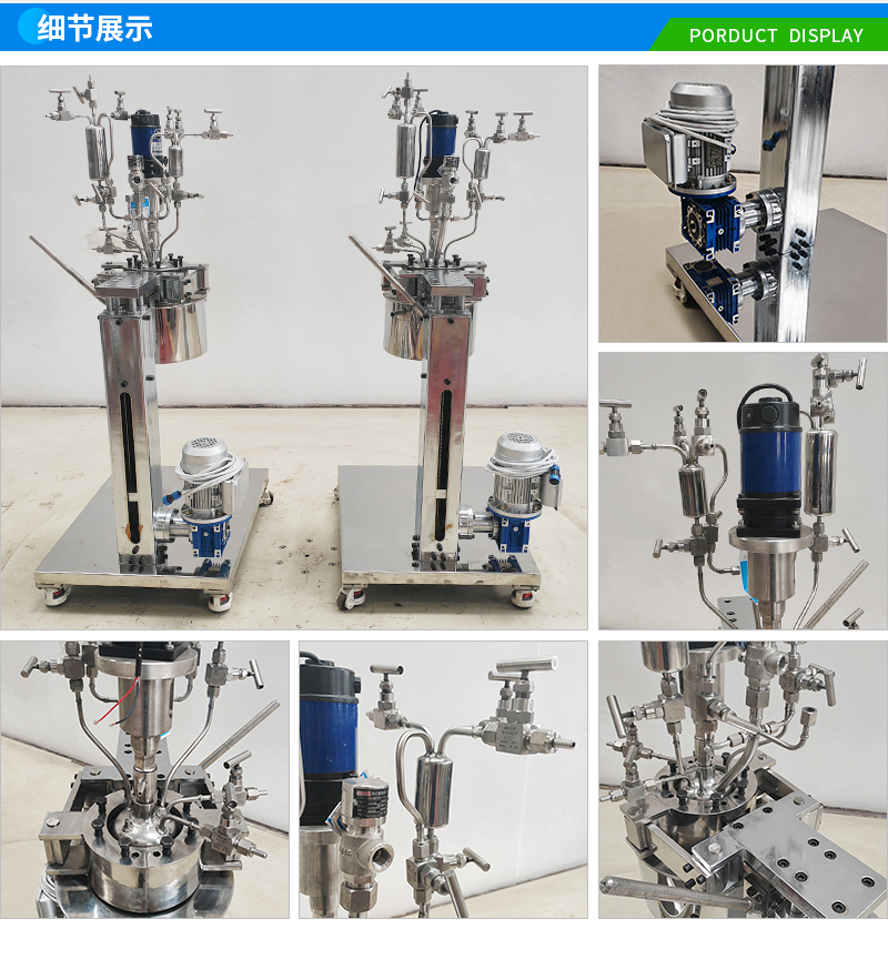 常規釜蓋開口 氣相口配針形閥,液相口配針形閥及釜內插底管,固體加料口配絲堵,測控溫口配鉑電阻,壓力表安全爆破口配壓力表及安全防爆裝置,釜內冷卻盤管進、出口配水咀