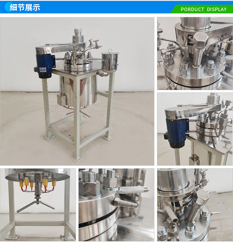 常規釜蓋開口 氣相口配針形閥,液相口配針形閥及釜內插底管,固體加料口配絲堵,測控溫口配鉑電阻,壓力表安全爆破口配壓力表及安全防爆裝置,釜內冷卻盤管進、出口配水咀
