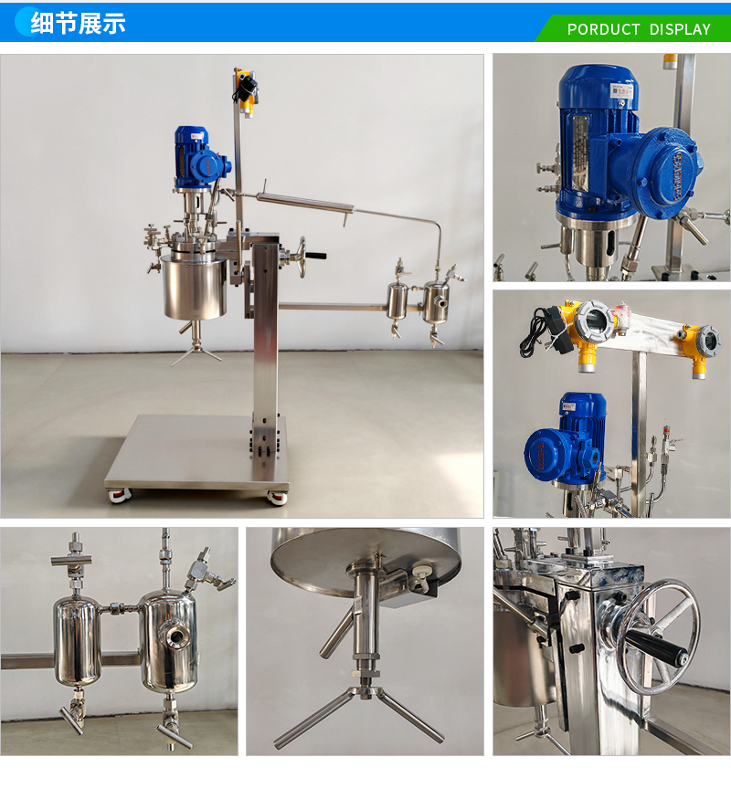 常規釜蓋開口 氣相口配針形閥,液相口配針形閥及釜內插底管,固體加料口配絲堵,測控溫口配鉑電阻,壓力表安全爆破口配壓力表及安全防爆裝置,釜內冷卻盤管進、出口配水咀